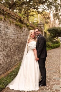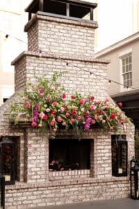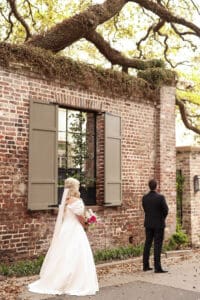The ceremony was held outdoors in front of a large fireplace, adorned with stunning florals draped across the mantle. The setting was intimate and refined, creating a backdrop that felt both natural and luxurious. Moments like the first look with her dad and then her first look with her husband took place just outside, where the quiet streets of downtown provided both privacy and incredibly aesthetic surroundings. The nearby historic streets, the Battery, and Rainbow Row offered endless opportunities for meaningful walks and candid photos at some of the couple’s favorite spots.