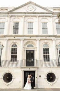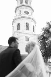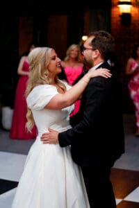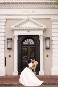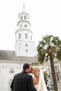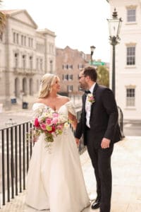 Having the wedding right in the middle of the city brought a unique energy. There is something special about blending the vibrancy of downtown Charleston with the intimacy of a wedding celebration. Later, the reception came alive with a live band, creating a sophisticated, joyous atmosphere that felt like class at its finest.
